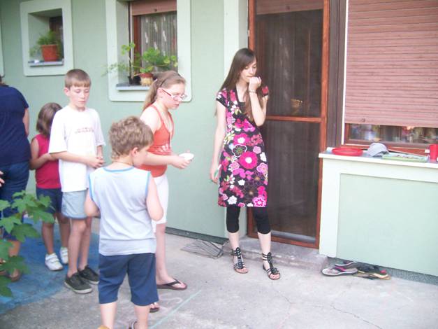 Aj dnes bol plný dvor detí. Dnes bol tretí, posledný deň pre našich najmenších, čo samozrejme bola smutná správa pre všetkých. Dnes sme vlastne mali dve skupiny detí. Jedna skupina boli deti z Jabuky a Alibunaru, ktorí tu vlastne boli cez najväčšie slnko, ale ich ani to neodradilo ani nezastavilo. Druhá skupina, od 17h znovu boli deti z Kovačice. Boli sme veľmi prekvapení detskou nekonečnou vytrvalosťou - skákali až do poslednej chvíle. :) Veľmi sme povzbudení veľmi pozitívnymi komentármi detí a rodičom a chceme naozaj aj budúci rok to zopakovať. Tiež, chceme vyjadriť svoju vďačnosť všetkým rodičom, že nám zverili svoje deti a že sme sa s nimi mohli hrať. Pre nás to bolo veľkým potešením! Samozrejme, to kamarátenie nemusí byť len raz ročne, ale každú nedeľu, od 15.30 h deti majú možnosť u nás v zbore sa učiť o Bohu, spievať, hrať rôzne hry a všetky deti sú vítané. Deti, do videnia... :)
